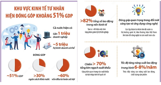 Theo số liệu từ Cục Thống kê, khu vực kinh tế tư nhân Việt Nam có khoảng hơn 940.000 doanh nghiệp và hơn 5 triệu hộ kinh doanh cá thể đang hoạt động, đóng góp khoảng 40 - 42% GDP, chiếm hơn 30% tổng thu ngân sách và tạo ra trên 85% việc làm cho xã hội.